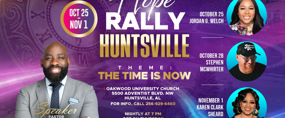 Huntsville, AL — September 10, 2025 — Breath of Life Television Ministries and Oakwood University Church are inviting the Huntsville community to join them for Hope Rally 2025, an unforgettable weeklong experience of faith, worship, and encouragement. With the theme “The Time is Now,” this citywide revival will run October 25 – November 1, 2025 at Oakwood University Church.
